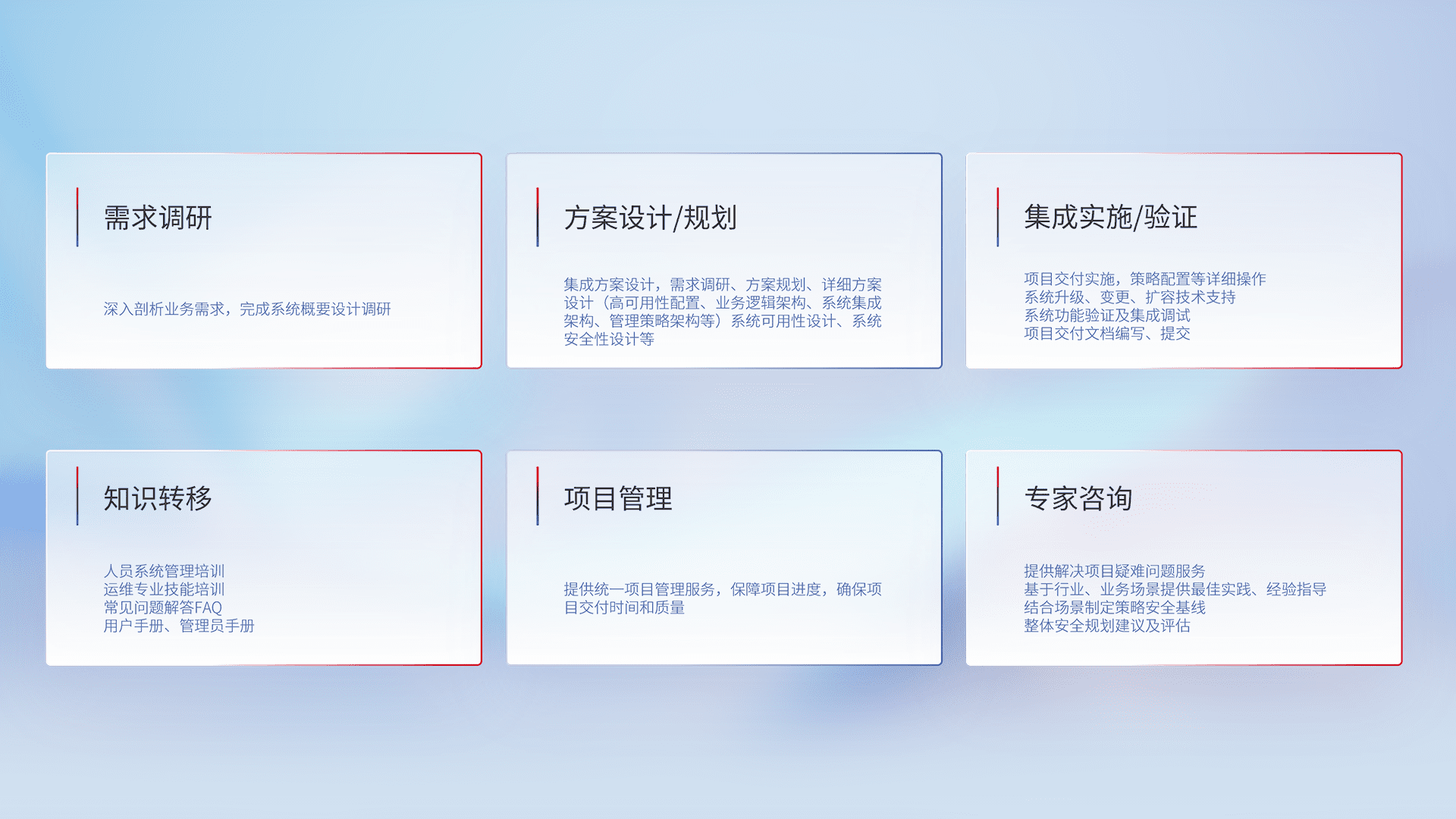 针对客户行业特性,,,将宏观的安全战略和需求,,,通过专业的交付服务,,实现项目落地,,,为客户提供标准规范的集成交付服务。。。